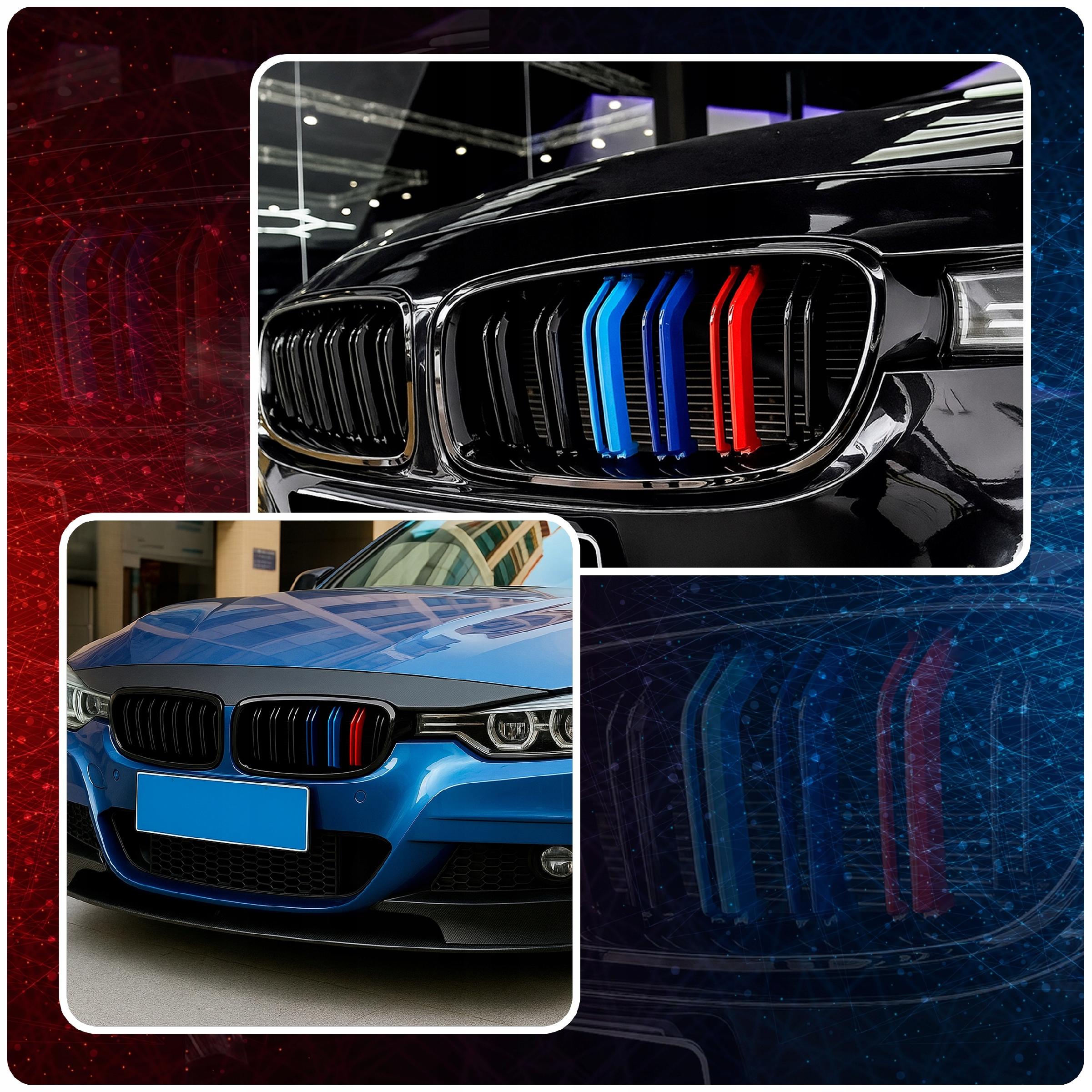 Żeberka grilla posiadają ozdobne wstawki w trzech kolorach – czerwonym, ciemnoniebieskim oraz jasnoniebieskim, co nawiązuje do legendarnej stylistyki BMW M Power i podkreśla sportowy charakter Twojego auta.