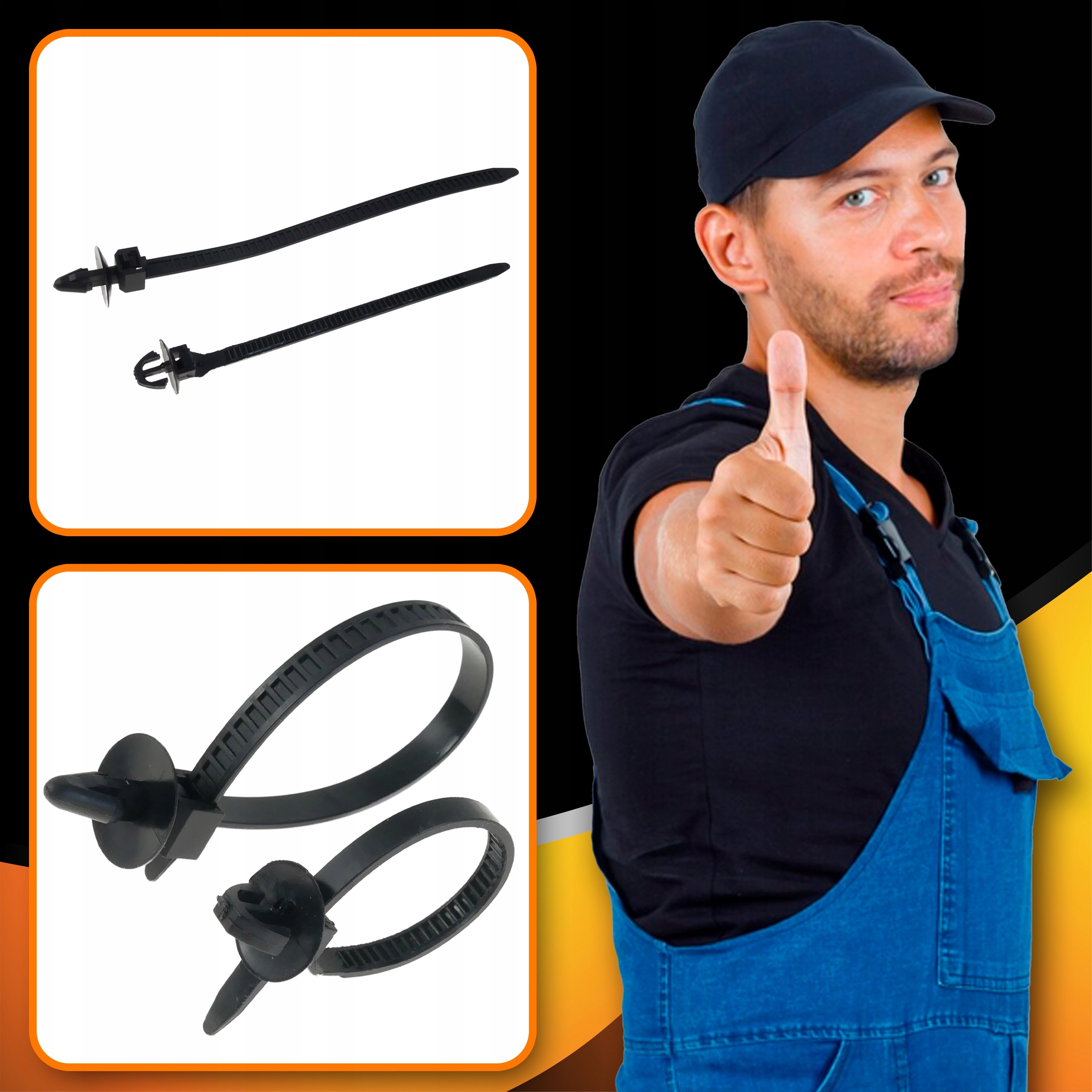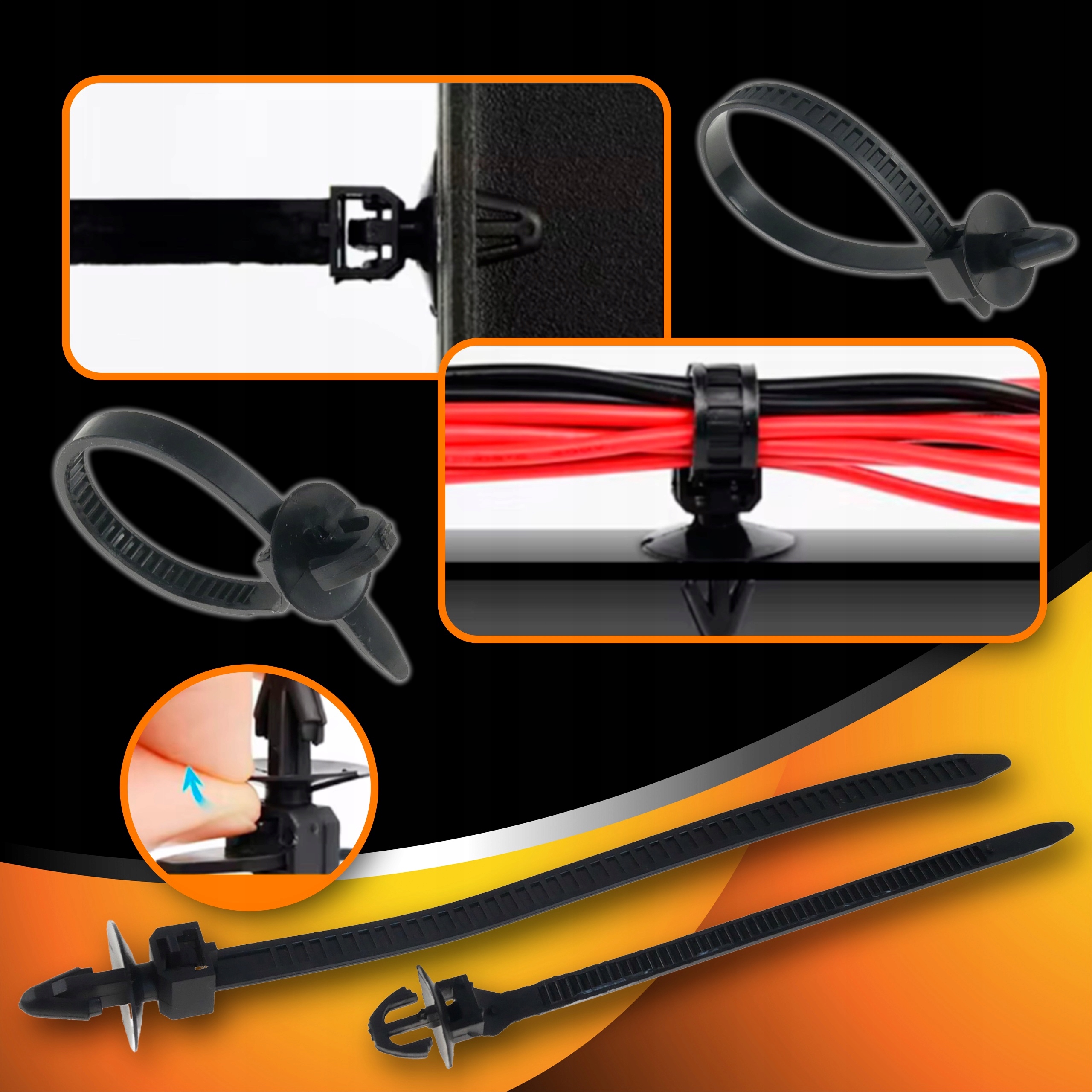 Opaski zaciskowo-kołkowe dołączone do zestawu posiadają funkcję zaciskową oraz odblokowanie, dzięki czemu można je wielokrotnie używać. Idealnie sprawdzają się do szybkiego spinania przewodów, mocowania elementów oraz porządkowania instalacji w samochodzie lub garażu.