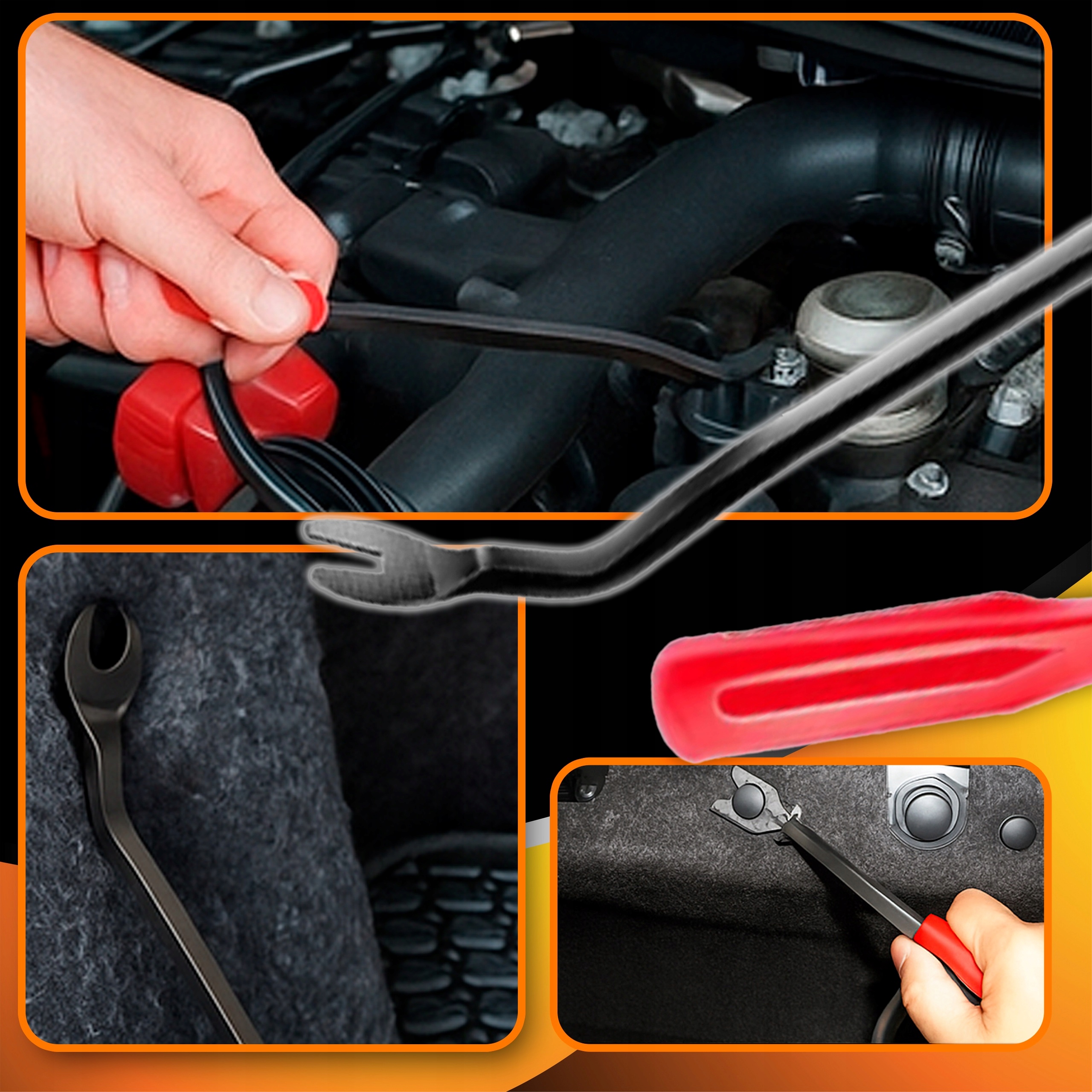 W komplecie znajduje się metalowe narzędzie typu widełki (szczypce) do wyciągania kołków mocujących tapicerkę. Dzięki specjalnej konstrukcji dźwignia umożliwia szybki i łatwy demontaż zapinek tapicerskich bez ryzyka ich uszkodzenia oraz bez niszczenia plastikowych elementów wewnętrznych auta.