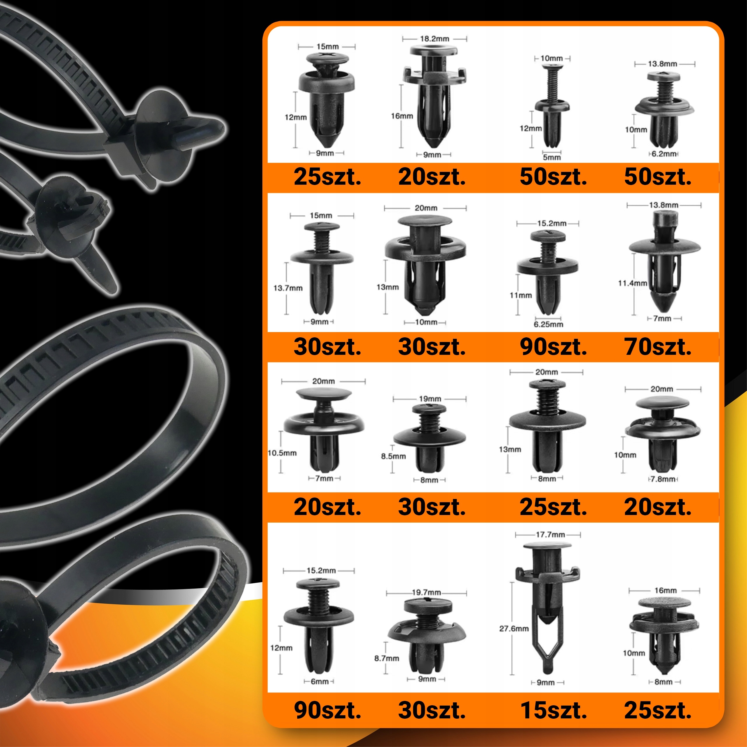 W skład zestawu wchodzą standardowe rozmiary stosowane w większości marek samochodów osobowych i dostawczych. Dzięki temu masz pewność, że zawsze znajdziesz odpowiedni kołek lub spinkę do szybkiego montażu lub wymiany.
